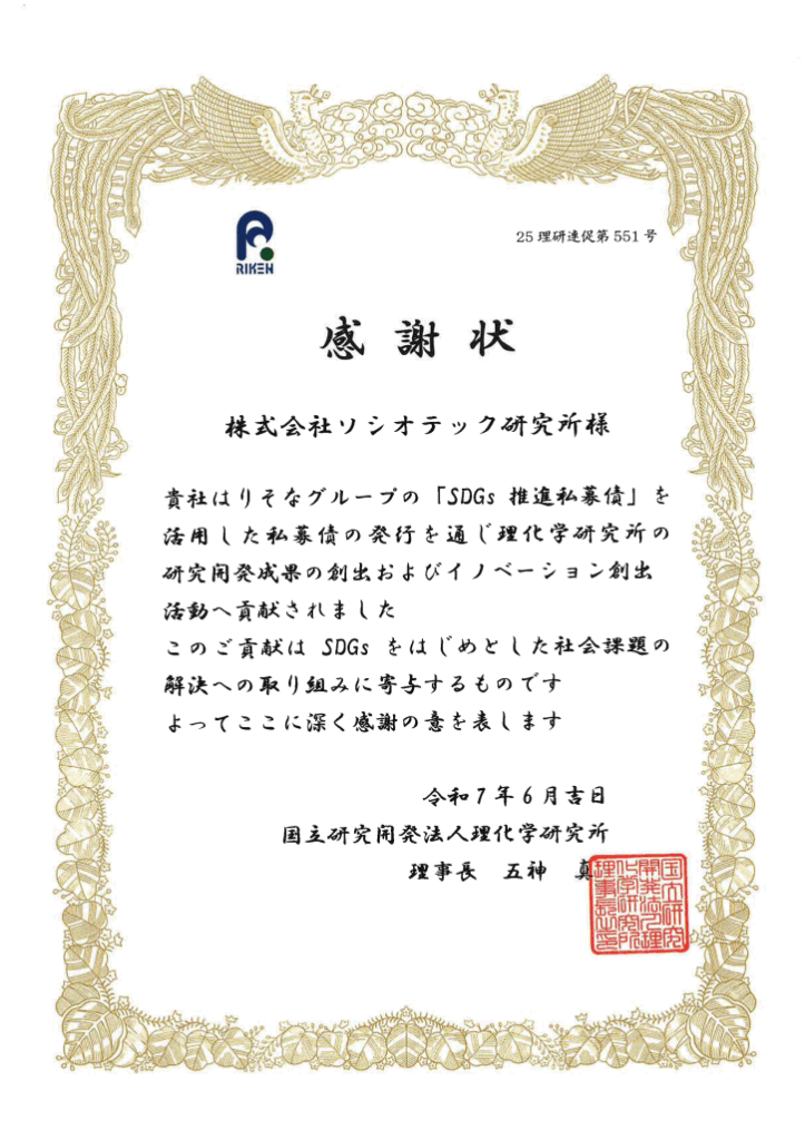 ソシオテック研究所は、りそなグループの「SDGs推進私募債」を活用し、理化学研究所の研究開発活動を支援しております。このたび、その取り組みが評価され、国立研究開発法人 理化学研究所様より感謝状を賜りました。